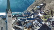 4K 60Fps Drone view of peaceful town Hallstatt and church next to lake in the Alps.