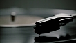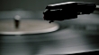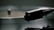 Vinyl record spinning on a turntable with the stylus or needle on the disc. Black and white with selected muted colour.