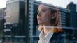 Businesswoman, thinking and window in city by buildings, ambition and career planning in new apartment. Young person, achievement or idea in corporate job or management with suit in urban cityscape - 4K stock video