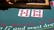 CLOSE ANGLE OF DEALER'S CARDS AT BLACKJACK TABLE. DEALER'S CHIPS VISIBLE AS SHE PASSES WINNINGS TO PLAYERS. CASINOS. GAMBLING.