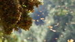CU cluster of Monarch Butterflies on a branch with others flying through forest in background - 4K stock video
