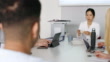 A dentist sitting at a desk surround by her students and explaining anatomy to them using a model of a human mouth.