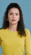 Disappointed, face and woman shaking head for bad news notification, problem or announcement of crisis. Disaster, fail and studio portrait of person unhappy about wrong mistake on blue background - 4K stock video