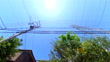 Driving through a residential area, looking up at the sky / power line / sun