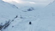 Drone clip flying forwards over a campervan parked up in the Scottish Highlands. The entire scene, including the road, is covered with snow - 4K stock video