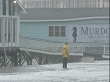 Emergency crews work near a gift shop as Hurricane Ike strikes Galveston, Texas. - stock video