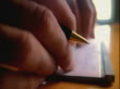 Extreme close up man's hands signing check on table and ripping it from checkbook - stock video