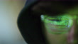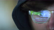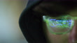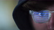 Extreme close up of male hacker coding on monitor screen while focus racks in the bright reflection in eye glasses