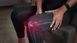 Footage close-up of Woman suffering from pain in the knee while sitting on the couch. VFX joint and knee pain augmented reality animation. Health care and medical concepts.