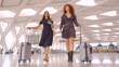 WS LA TS smiling female friends looking at smart phone while walking through airport terminal before traveling