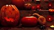 Halloween pumpkin head jack lantern on wooden background - HD stock video