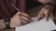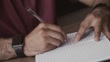 Hands of young businessman writing strategy in Arabic script at office cafeteria