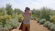 Wide shot of smiling husband lifting and spinning laughing wife while walking on garden path at boutique luxury resort during vacation in Morocco