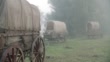 MEDIUM ANGLE OF COVERED WAGONS IN FIELD. TREES AND RIVER PARTIALLY VISIBLE IN BG. MIST, FOG, OR SMOKE HANG S IN AIR. - HD stock video
