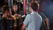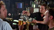 Medium shot dolly shot male bartender serving glasses of beer to three men sitting at bar / toasting and drinking - HD stock video
