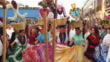 Mexico tradition. Calendas is a parade and celebration typical from Oaxaca. Mexican women named Chinas dressed in traditional costume. They are dancing performing a choreography with the colorful skirts. Walking stilts in the foreground - 4K stock video