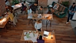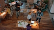 Wide crane shot of people in a busy startup company office.