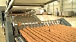 Cookies on conveyor at food plant. Food industry. Pastry bakery on manufacturing line at food factory.