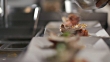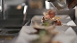 Restaurant chef garnishes gourmet lobster dish in restaurant kitchen