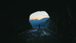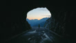Tracking shot silhouetted woman jogging out of dark tunnel toward remote mountain range at sunrise. Shot in 8K Resolution.