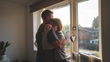 A slider shot showing a mature couple sharing an embrace/cuddle at home. The evening sun is coming in through their bedroom window - 4K stock video