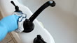 ++Note to Inspector: The red spot on the handle is the latch for the tip. The symbol on the tip is a generic steam icon similar to what you would see on a clothes iron. The silver band text reads, "Caution: Hot surface, avoid contact!" and the silver handle sticker reads, "Warning, hot steam can scald, do not point steam towards persons or pets". There are no brand names or trademarks on the handle. Thank you for your consideration.++