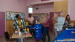 Handheld wide shot of a food bank being run by volunteers at a community church in the North East of England. Mixed age and ethnic people in need are collecting groceries/toiletries there, including senior adults and a single mother with her young daughter. The mother and daughter collect a bag of tangerines from one of the volunteers.