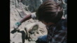 1970s: Boys digging into rock. Man and boy working on dig site. Boy covering fossil in plaster