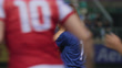 Slow motion shot of two emotional female football players as they hug and embrace each other in pure shock of the successful play that just occurred