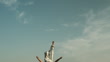 Slow motion lockdown shot of young woman jumping upside down with arms outstretched against sky