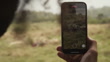 Rack focus shot of young man filming lioness eating meat through smart phone at national wildlife park